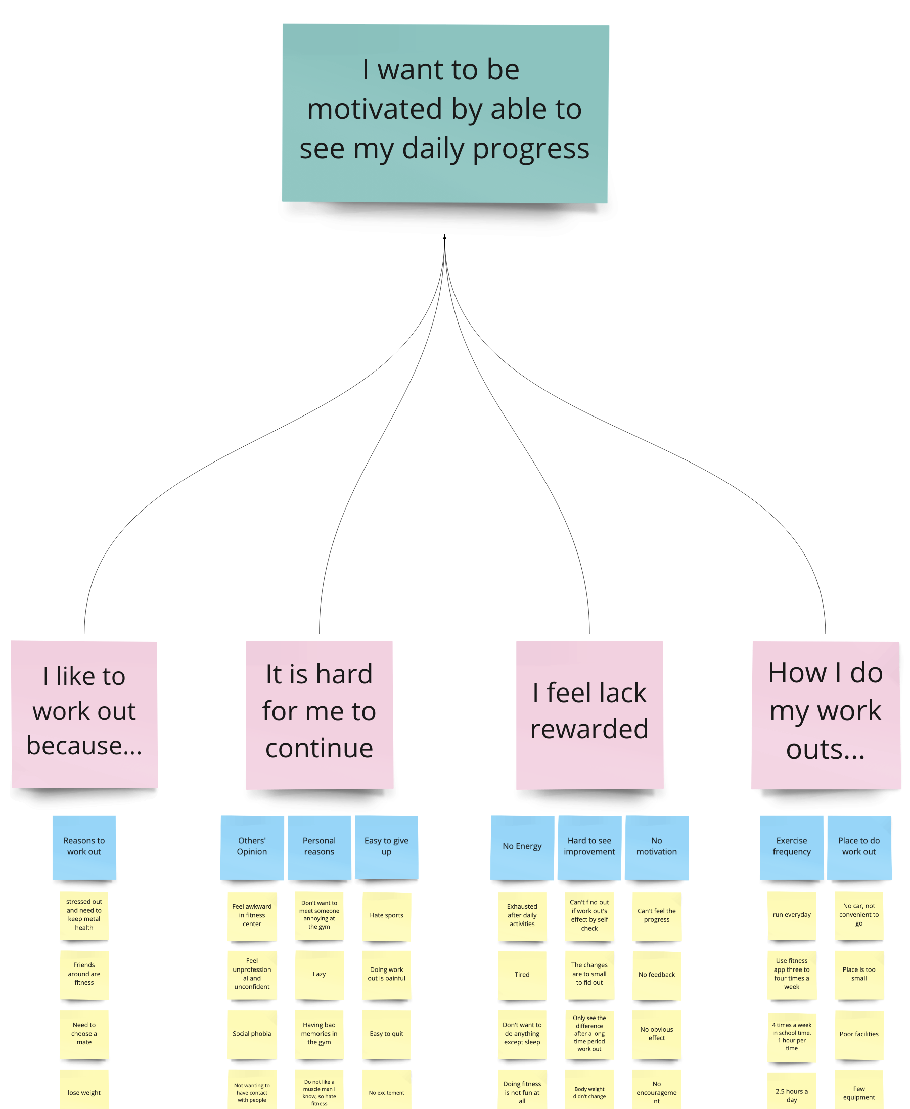 In the interpretation session, transcribe interview notes to affinity notes (post-it notes or a digital equivalent) and arrange them on an affinity diagram constructed in a bottom-up manner. Write affinity notes in the first person as the interviewee. After clustering, add labels at different hierarchical levels. The process is described in detail in Holtzblatt, Wendell, and Wood (2005).