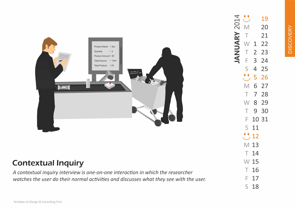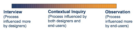 Contextual inquiry is an interview-oriented technique that requires the interview to occur in the workplace during work. An important tenet of contextual inquiry is that the interviewer not examine her notes until an interpretation session, which is conducted under strict rules.