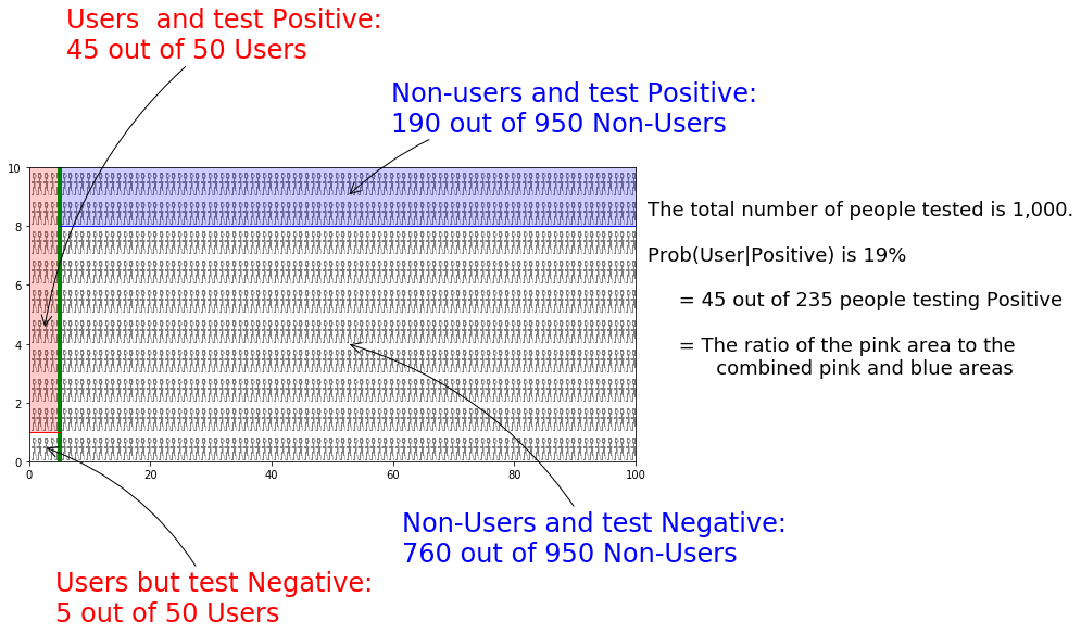 The intuition is that we usually know something and shouldn’t go into problem solving with no assumptions. An example of drug user testing given by Wikipedia is shown in the following frame graphically, where the test is ninety percent sensitive to a recipient being a drug user. The test is also eighty percent specific, meaning that it can detect that a non-user is a non-user eighty percent of the time.