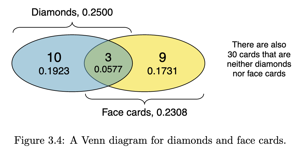 The textbook uses playing cards to illustrate concepts like cards that are neither diamonds nor face cards. You have to familiarize yourself with playing cards to understand these examples. The textbook uses the following Venn diagram to illustrate the above example.
