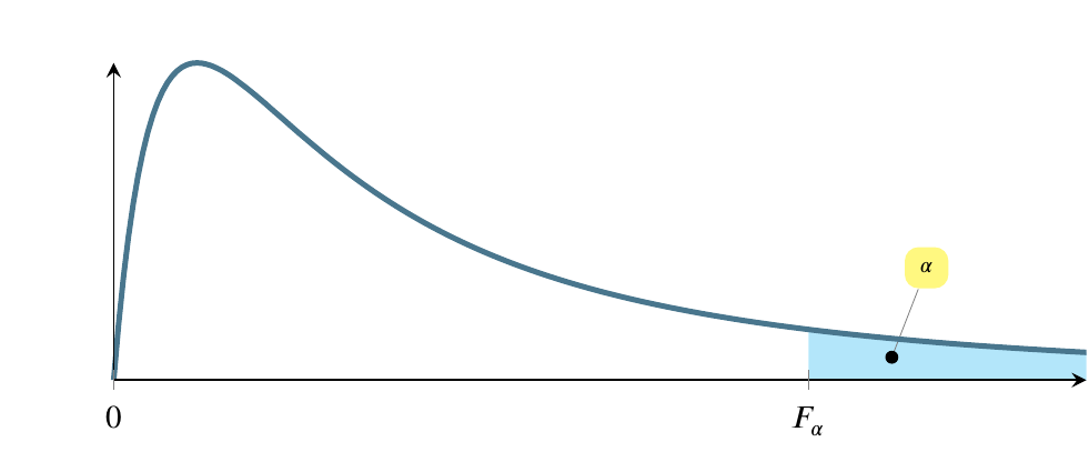 Another distribution that we’ll enounter later is called the F distribution. We’ll calculate an F-statistic when we build linear regression models, but I just want you to know the general shape of it for now. The region marked \(\alpha\) corresponds inversely to the magnitude of the F statistic. In other words, a larger F statistic means a smaller \(\alpha\).