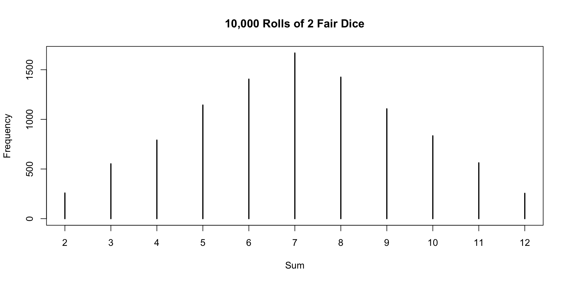 Francis DiTraglia shows the following example of plotting the probability distribution for rolling two fair dice on his website.
