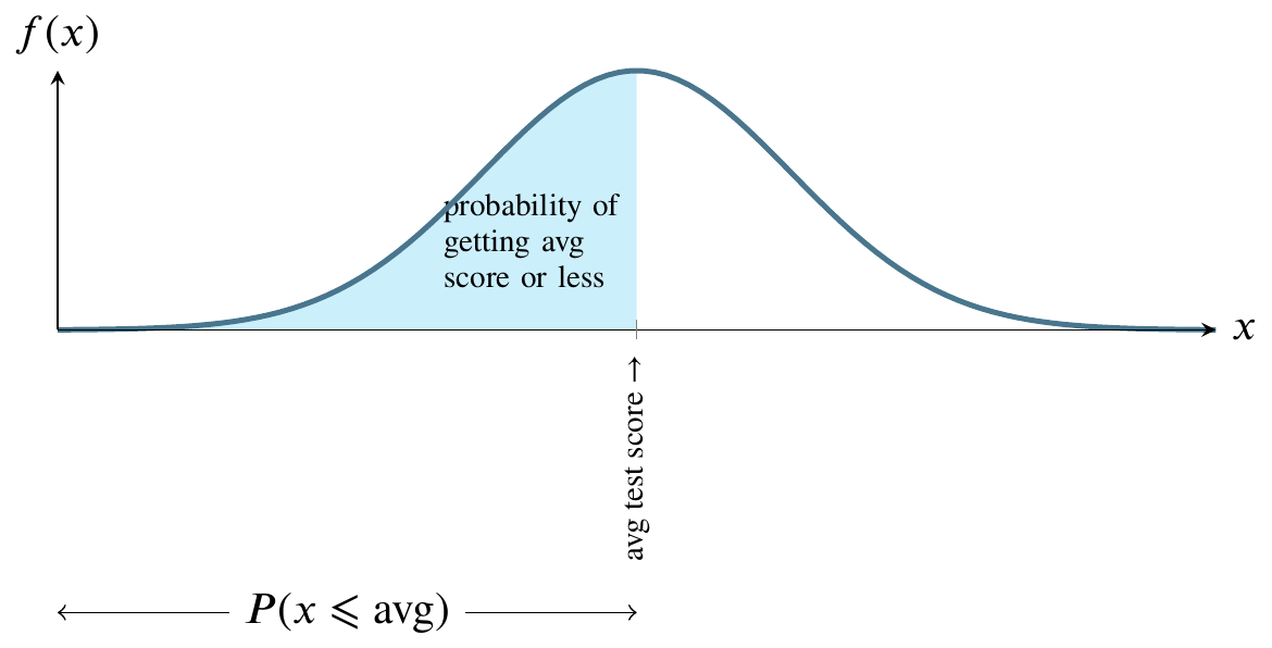 Let’s get back to the example of a nationwide test. If we say that students nationwide took an test that had a mean score of 75 and that the score was normally distributed, we’re saying that the value on the \(x\)-axis in the center of the curve is 75. Moreover, we’re saying that the area to the left of 75 is one half of the total area. We’re saying that the probability of a score less than 75 is 0.5 or fifty percent. We’re saying that half the students got a score below 75 and half got a score above 75.