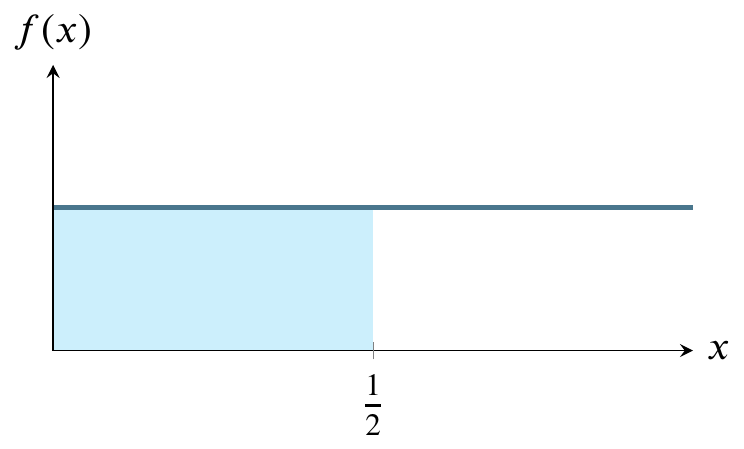 Here’s a graph of the the uniform distribution of numbers generated by the machine. The horizontal line is the probability density function and the shaded area is the cumulative distribution function from 0 to 1/2. In other words, the probability of the machine generating numbers from 0 to 1/2 is 1/2.