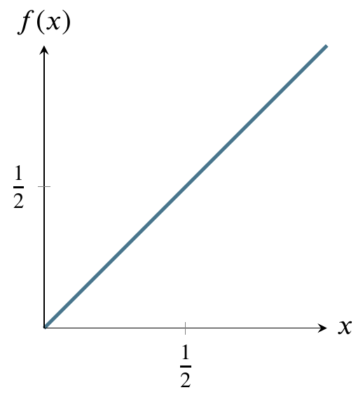 Reading it is the same as reading the cumulative distribution function for the normal distribution. For any value on the \(x\)-axis, say, 1/2, go up to the diagonal line and over to the value on the \(y\)-axis. In this case, that value is 1/2. That is the area under the horizontal line in the probability density function graph from 0 to 1/2 (the shaded area). For a rectangle, calculating area is trivial.