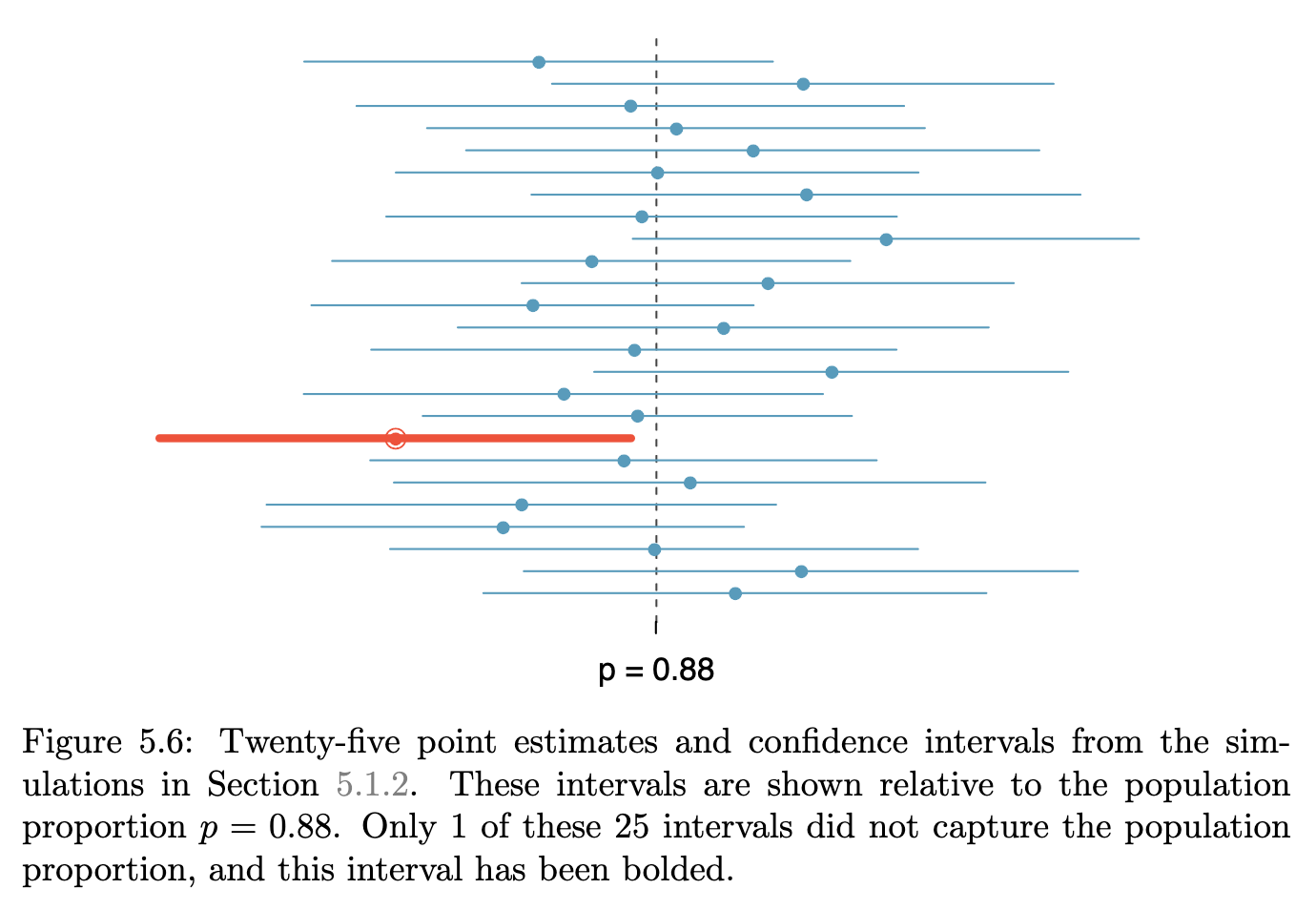 The confidence interval consists of two numbers, a lower bound and an upper bound, and we say that, if we collected an infinite number of samples of point estimates, \(x\) percent of them would would capture \(p\) within the lower and upper bound. \(x\) is usually 90 or 95 in practice.