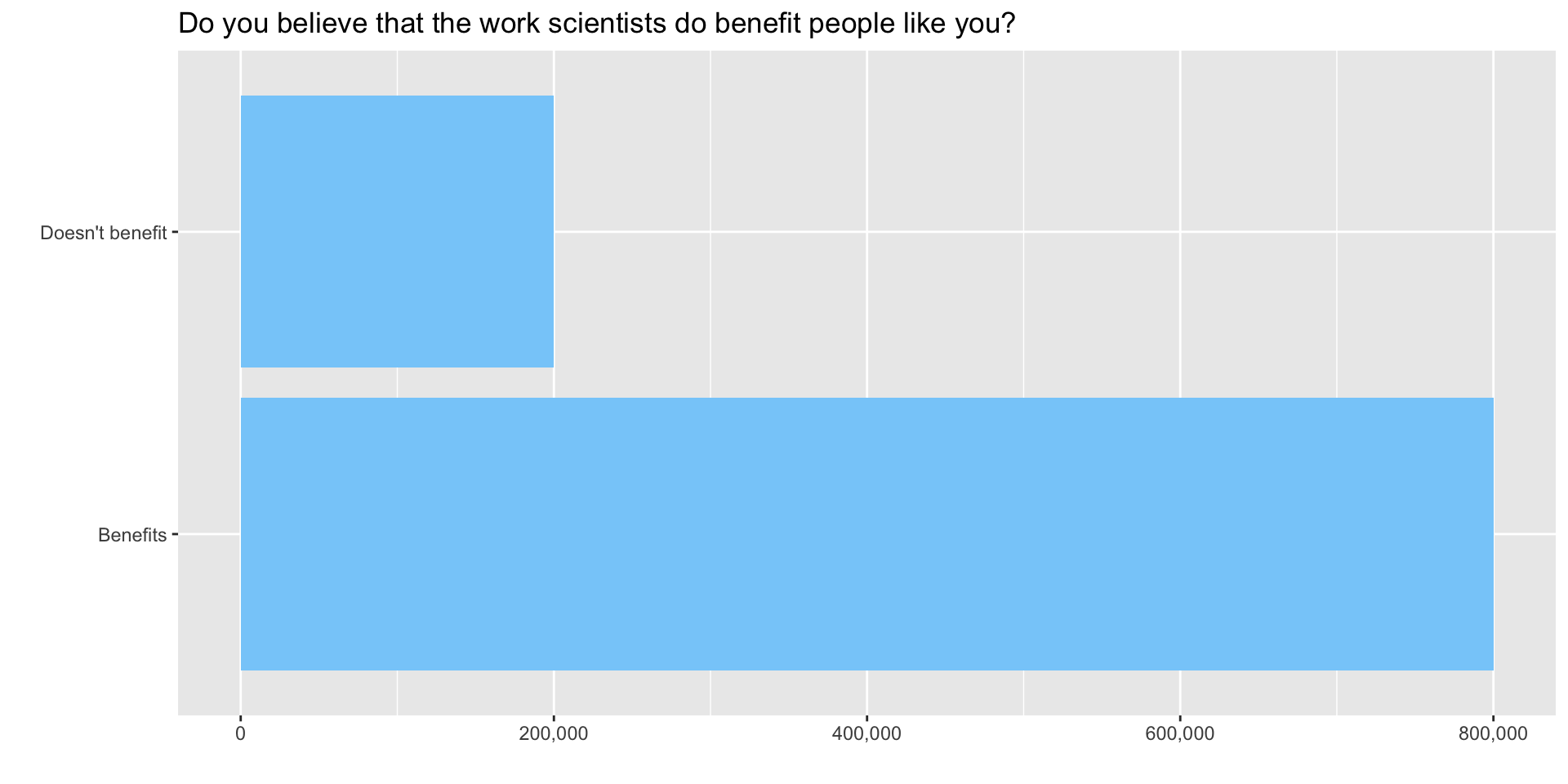 The Wellcome Global Monitor project finds that 20% of people worldwide don’t think that the work of scientists benefits people like them. Let’s simulate this situation using the tidyverse.