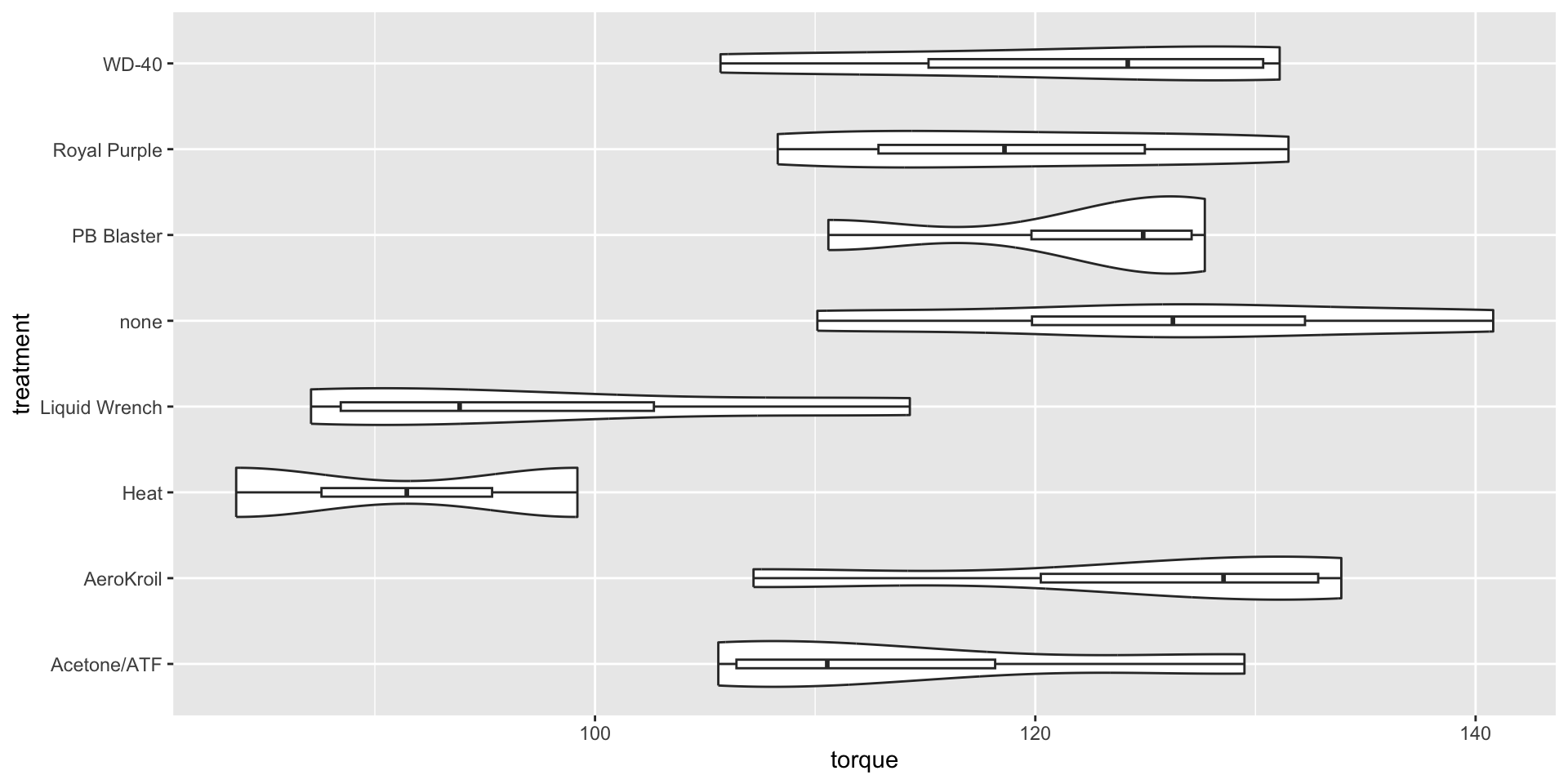Here you are comparing whether any of the eight means of torque differ. They certainly seem to, with a large \(F\)-statistic and a small \(p\)-value. It might be helpful to visualize the differences with a combination violin plot and boxplot. There are really too few samples for each treatment.