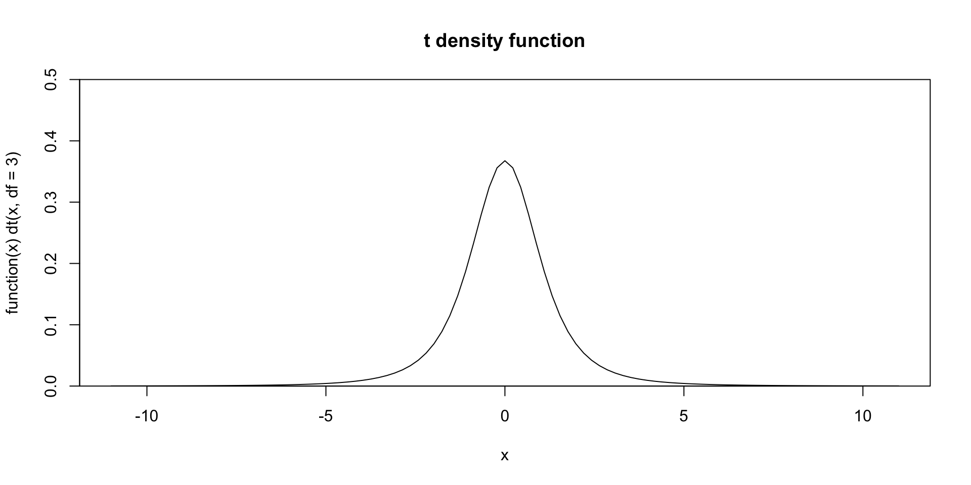 For sample sizes over thirty, it converges to looking like the normal distribution, but for smaller samples, it gets more and more peaked and the tails get thicker and thicker. For example, here is the density function for a sample size of 4.