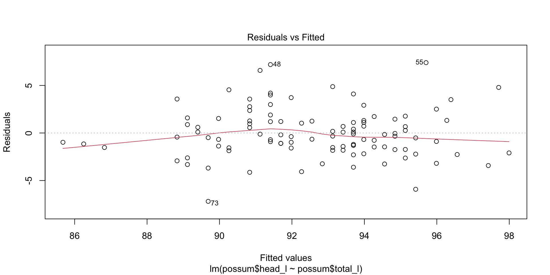 lm(formula = possum$head_l ~ possum$total_l)